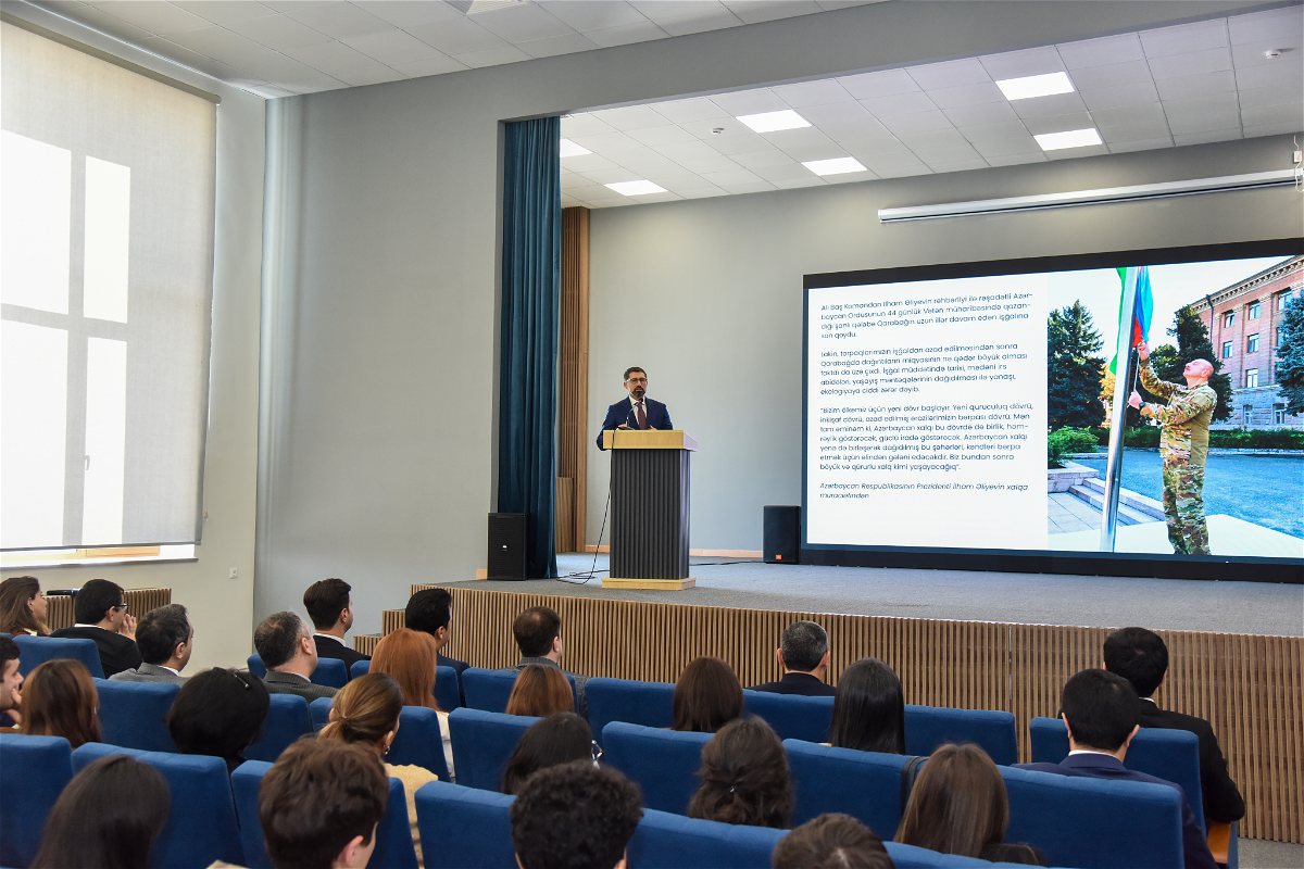 Rektor həmçinin, Müzəffər Ali Baş Komandan, Prezident İlham Əliyevin rəhbərliyi ilə Vətən müharibəsində qazandığımız möhtəşəm qələbədən sonra qarşıda duran əsas vəzifələrdən danışaraq, bu sahədə gənclərin və tələbələrin üzərinə düşən məsuliyyəti vurğulayıb. O, Qarabağın bərpası ilə bağlı aparılan müzakirələrdə və keçirilən tədbirlərdə tələbələrin fəal iştirak etmələrinin təqdirəlayiq hal olduğunu söyləyib.