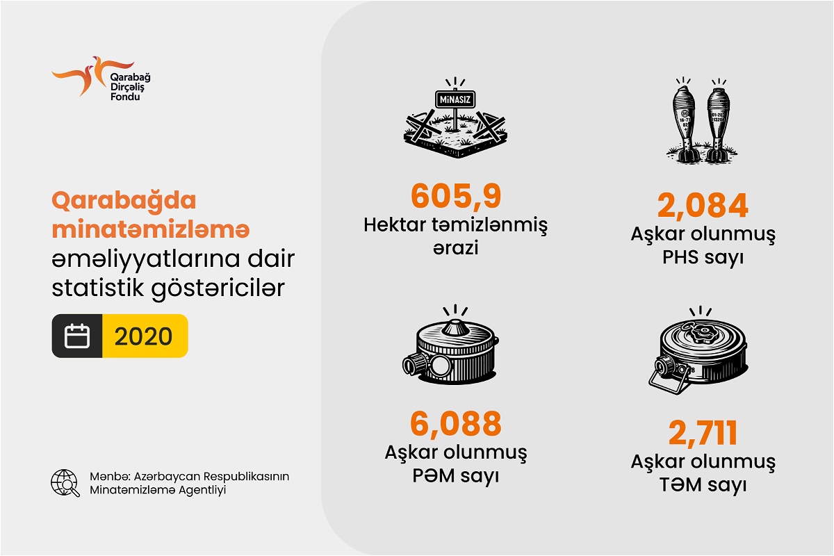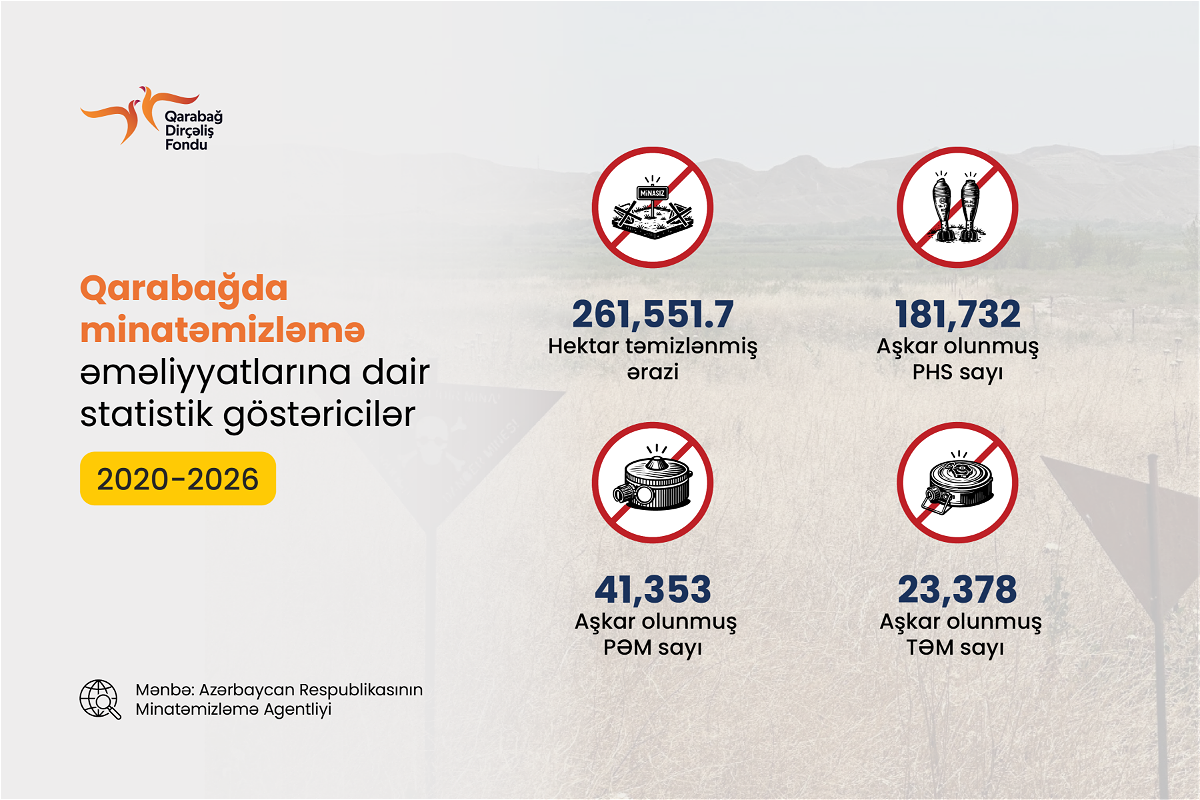 Prezident İlham Əliyevin rəhbərliyi və uzaqgörən siyasəti nəticəsində humanitar minatəmizləmə ölkə üzrə strateji prioritetə çevrilib. 2020–2026-cı illər ərzində 261 500 hektardan çox ərazi minalardan təmizlənib. 41 000-dən artıq piyada əleyhinə mina, 23 000 tank əleyhinə mina və 181 700 partlamamış hərbi sursat aşkar edilərək zərərsizləşdirilib. Bu ANAMA-nın və prosesə cəlb olunmuş bütün müvafiq dövlət qurumlarının yorulmaz və fədakar fəaliyyəti nəticəsində əldə olunmuş mühüm nailiyyətdir.