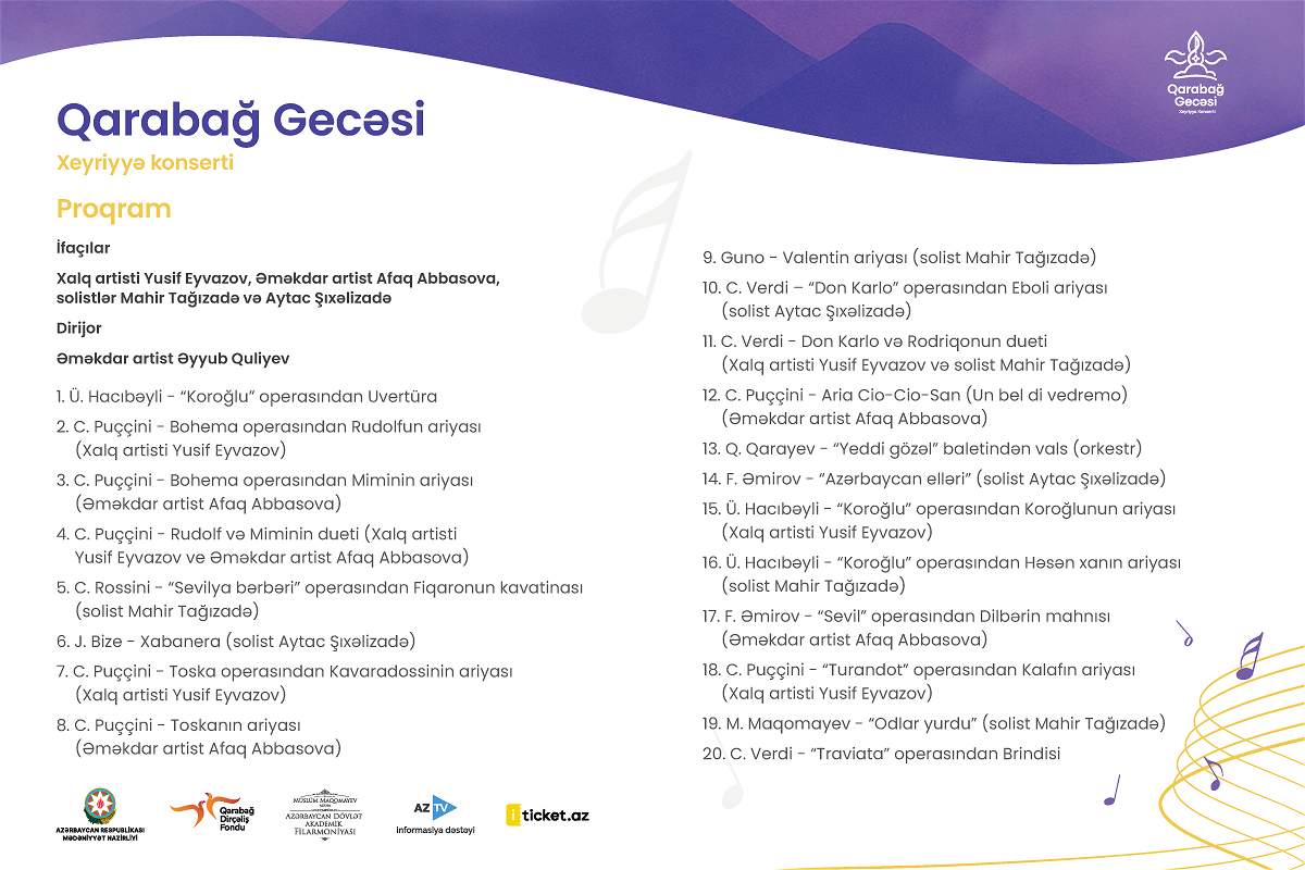 Bilet əldə etmək, eyni zamanda konsertin proqramı ilə tanış olmaq üçün linkə keçid edin: https://iticket.az/events/concerts/karabakh-night-charity-concert010/157313